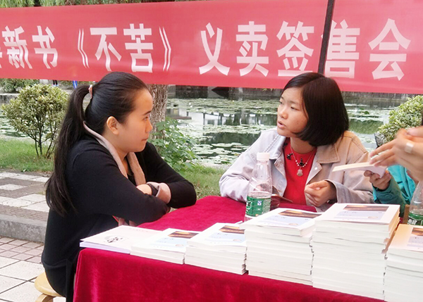 本网讯 10月14日,金沙集团人文与社会科学学院14级学生龙夏萍新书《不苦》义卖签售会在爱莲湖畔举行,义卖善款将于重阳节,直接送到零陵区柳子街的困难老人手中。