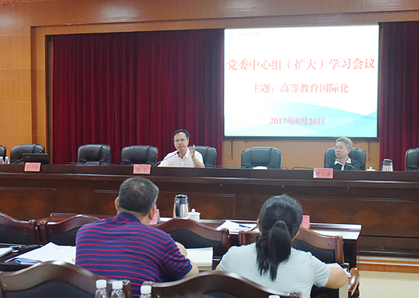 本网讯 9月26日下午,学校举行党委中心组(扩大)学习会议,围绕高等教育国际化作专题研讨。党委书记陈弘,副校长宋宏福、李常健、程智开出席会议,会议由校长曾宝成主持。