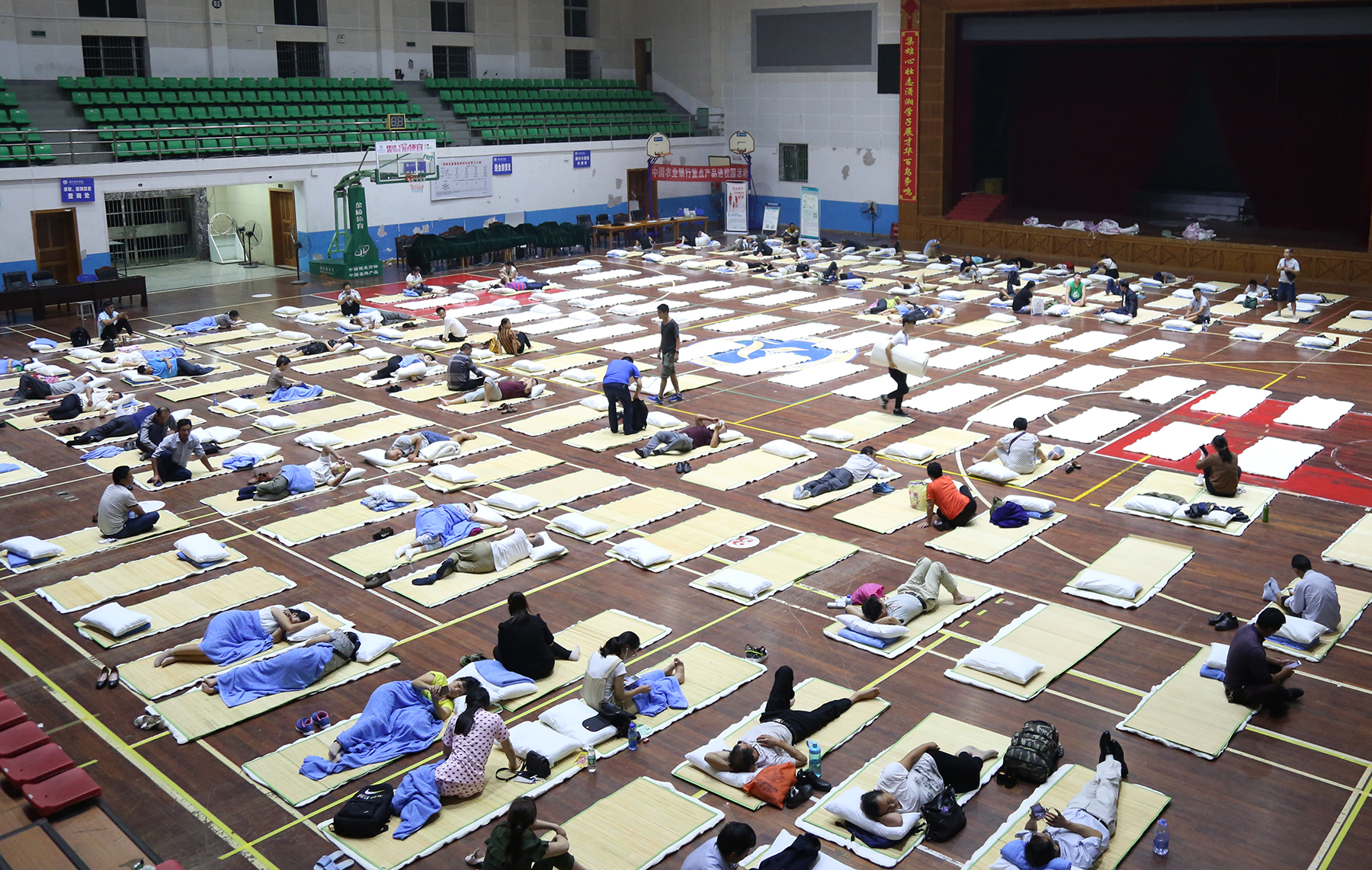 9月16日晚,在学校临时设置的新生家长休息站,新生家长正在休息。据了解,学校将体育馆设置成新生家长临时休息站, 铺设临时床位,为家长提供温馨舒适的留宿点。