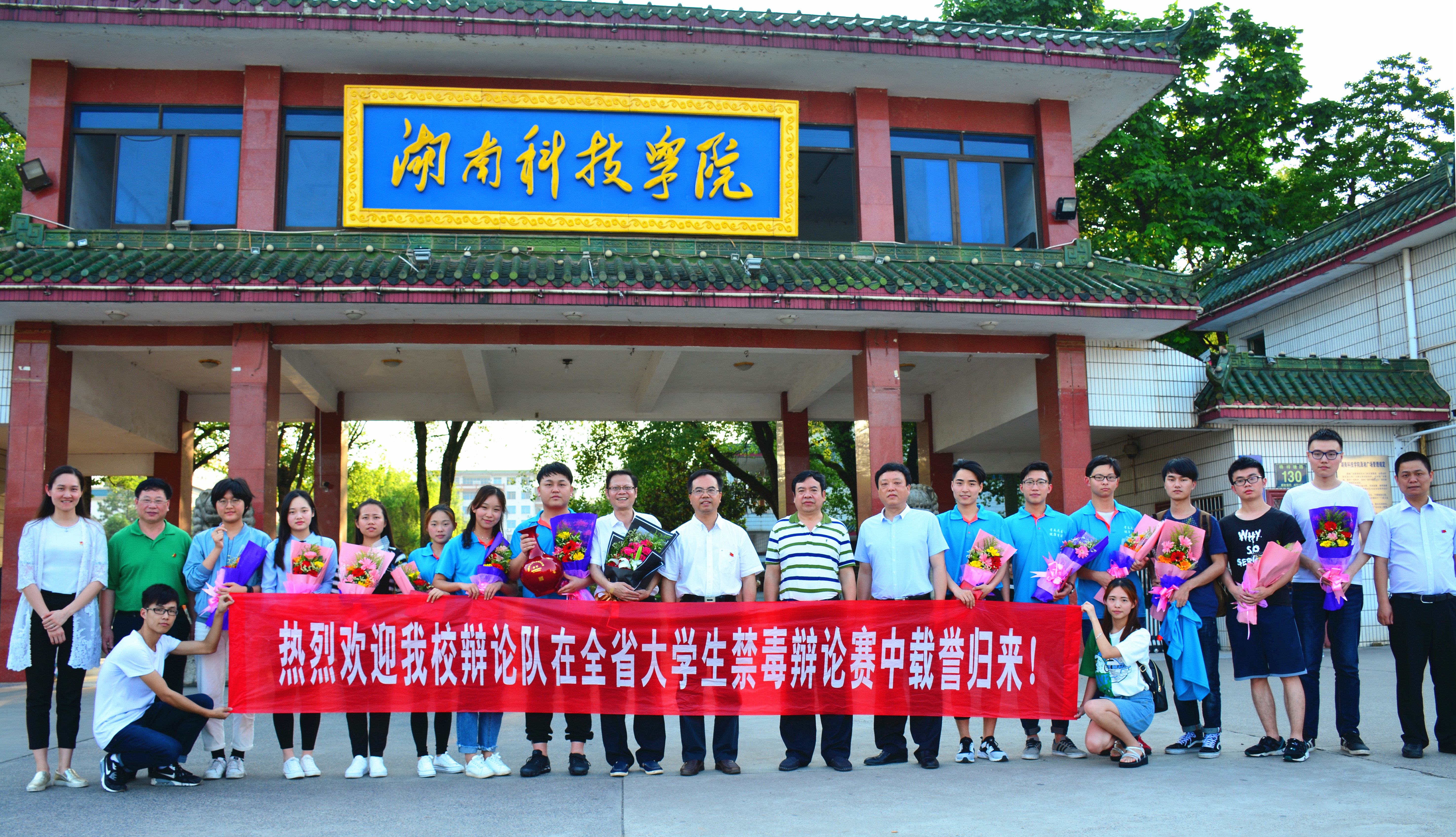 本网讯 5月10日下午,金沙集团辩论队选手在全省大学生禁毒辩论赛中脱颖而出,斩获季军。党委书记陈弘一行在校门口迎接载誉归来的辩手。