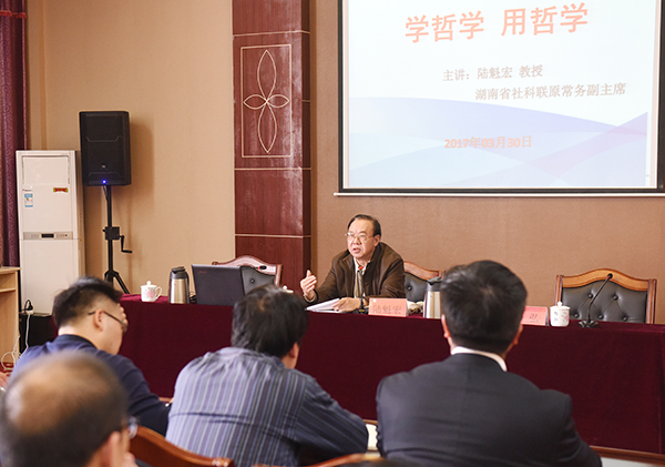 陆魁宏先后任湖南省社科院党组副书记兼副院长、省社科联执行主席兼湖南经济社会发展学院院长,竭尽毕生精力致力于哲学研究。今年已81岁高龄的陆老,从习近平总书记高度重视马克思主义哲学学习应用、毛泽东同志号召让哲学走出书斋为广大干部所掌握、哲学无用论剖析三大方面,讲述了自己学哲学、用哲学以及和哲学的不解之缘,他从国际民生到自然学科,从社会规律到理论实践,在两个小时的讲座中,陆老娓娓道来,讲述了哲学的无穷魅力。