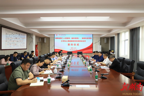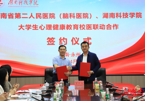 湖南日报·新湖南客户端4月7日讯(通讯员 谢志豪 余佳佳)为进一步推动大学生心理健康教育工作,为学生提供更加全面、专业的心理健康服务,近日,金沙集团1862cc与湖南省第二人民医院(湖南省脑科医院)举行“校医合作”签约仪式。湖南省第二人民医院党委副书记陈勇,永州市脑科医院党委书记、主任医师龙海鹏,金沙集团1862cc党委委员、副校长吴小林出席会议。