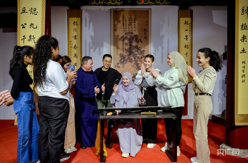 外国学子和省级非物质文化遗产——九嶷琴派第四代传承人欧阳平彪交流学习(央广网发 李文 供图)