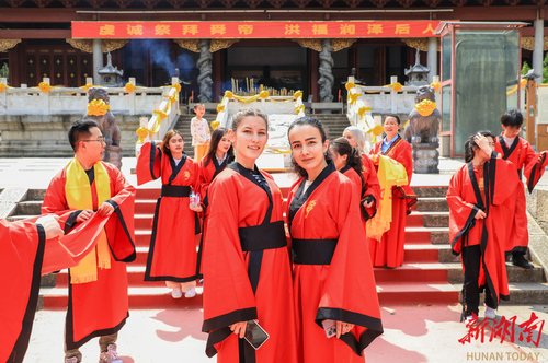 活动以传承和弘扬道德文化的鼻祖-舜文化、促进中外文化交流为主题。中外学生观礼国家级非物质文化遗产——舜帝祭典暨中外交流祈福仪式。他们换上祈福服装,与游客一同虔诚祈福。随后,省级非物质文化遗产——九嶷琴派第四代传承人欧阳平彪,现场演绎舜帝南风歌等经典古琴曲目,引领中外学子了解“舜弹五弦之琴,以歌南风,以礼乐来教化大众”的典故。舜德孝老爱亲先进典型代表邓慧芊,以自身践行孝老爱亲行动,宣讲舜德孝文化。外籍教师梅西博士及留学生代表,用英语介绍九嶷山历史文化和风土人情。中外学子还在舜帝陵广场开展中外文化交流活动,并一同植下了象征国际友谊的“友谊常青树”。