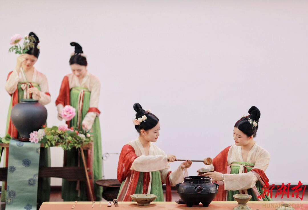 该校师生以及潇湘文旅研学社成员精心表演了唐代煎茶《槐序雅集》,沉浸式体验了中华茶文化的雅致和深邃。
