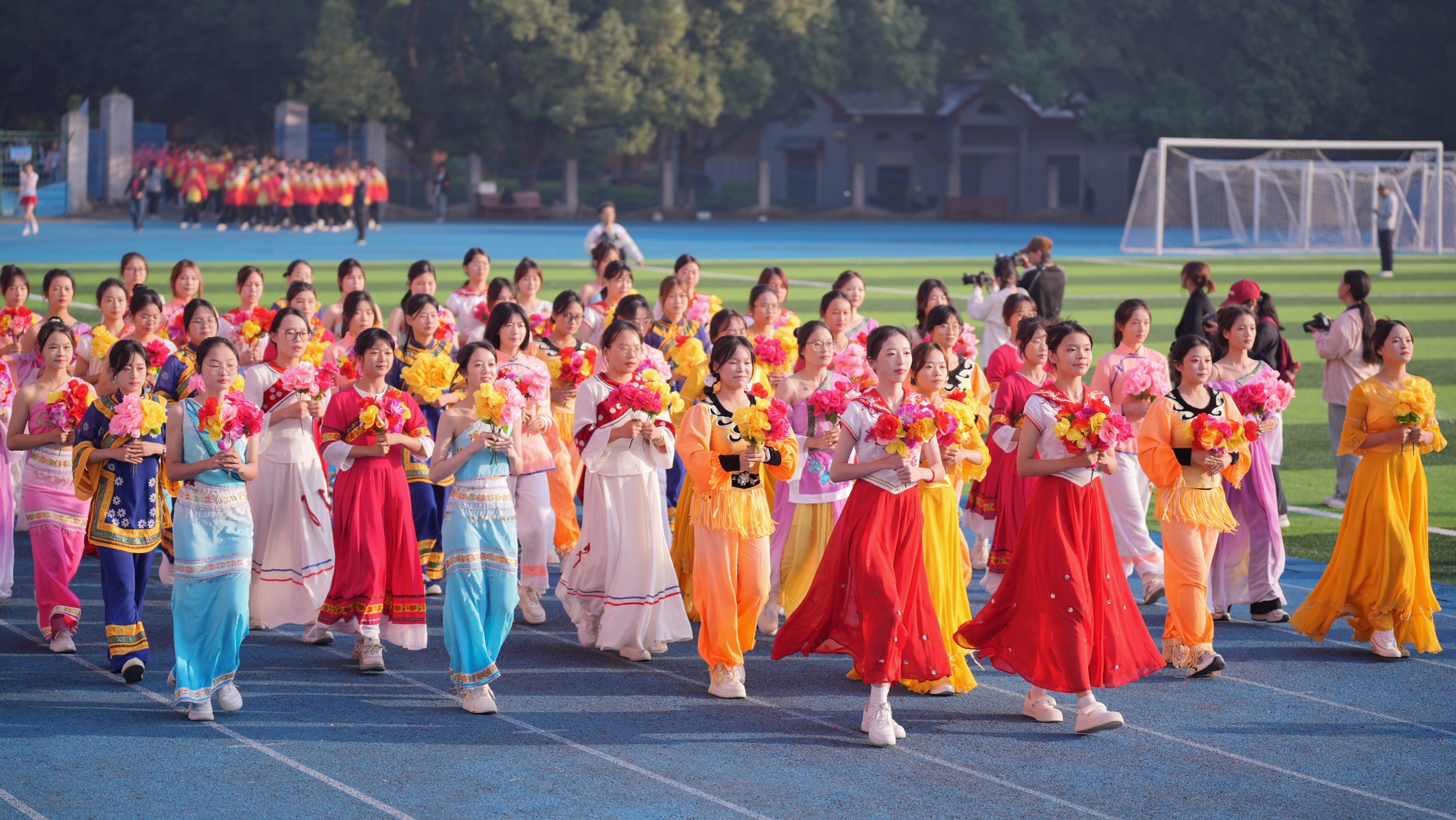 伴随着激昂的运动进行曲,护旗手们伴随着运动员进行曲昂首阔步的迈向主席台,他们高擎着国旗和校旗,坚毅的步伐掷地有声,彰显着科院学子的青春活力和磅礴力量。紧随而来的便是各个学院的表演方阵,嘹亮的口号与每个学院的特色结合,整齐的队伍向全校师生展现出勇夺佳绩的决心与信念。
