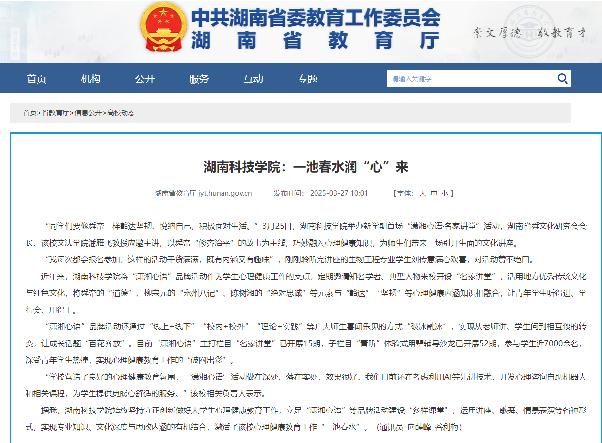 “学校营造了良好的心理健康教育氛围,‘潇湘心语’活动做在深处、落在实处,效果很好。我们目前还在考虑利用AI等先进技术,开发心理咨询自助机器人和相关课程,为学生提供更暖心舒适的服务。”该校相关负责人表示。