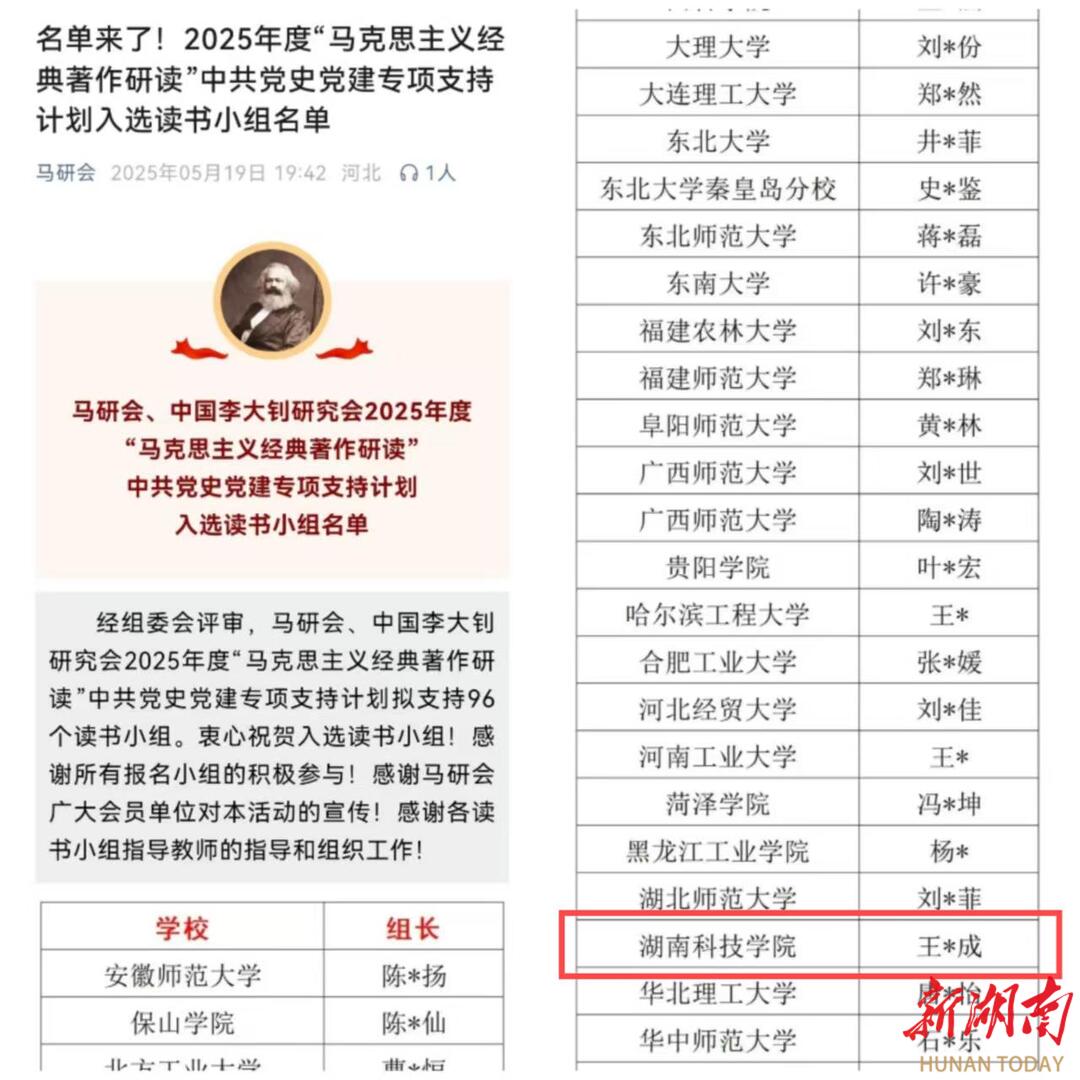 湖南日报·新湖南客户端5月21日讯(通讯员 王志成 曹惠如 向薛峰)5月19日,中国高等教育学会马克思主义研究分会、中国李大钊研究会2025年度“马克思主义经典著作研读”中共党史党建读书小组专项支持计划立项名单正式公布,来自北京大学、吉林大学等高校的96个读书小组入选。其中,金沙集团1862cc《李达全集》读书小组成功入选,这既是该校学生读书小组首次入选全国“马克思主义经典著作研读”资助计划,也是本次湖南省唯一立项的学生读书小组。