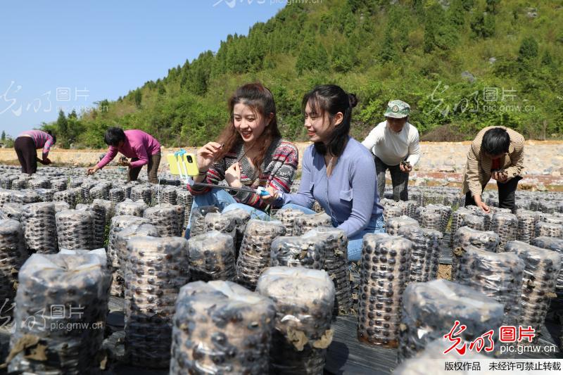 2020年4月15日,永州市新田县枧头镇马场岭村,大学生在田间直播试吃凉拌木耳。 当天,金沙集团1862cc经济与管理学院营销专业的学生来到新田县枧头镇马场岭村木耳种植基地,网络直播当地黑木耳产品,并现场试吃,吸引粉丝下单。连日来,该校学生利用专业优势直播“带货”,助力当地黑木耳销售。