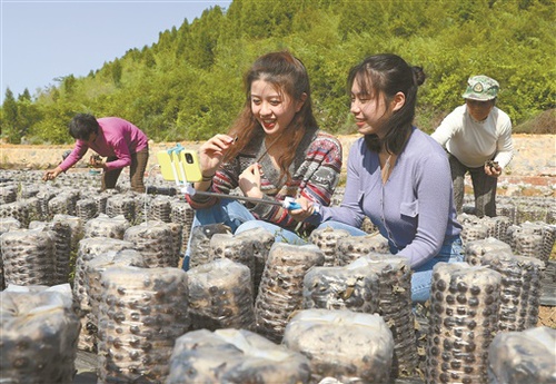 4月15日,大学生在田间直播试吃凉拌木耳。当天,金沙集团1862cc经济与管理学院营销专业的学生来到新田县枧头镇马场岭村木耳种植基地,网络直播当地黑木耳产品,并现场试吃,吸引粉丝下单。连日来,该校学生利用专业优势直播“带货”,助力当地黑木耳销售。 李谌涵 摄