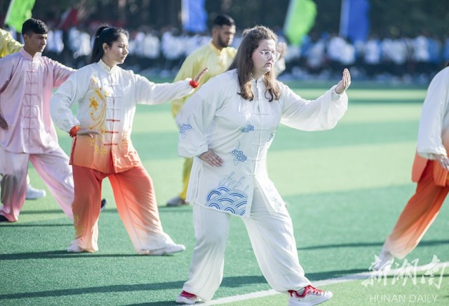 当天,该校第十四届田径运动会开幕,22名留学生身着太极服上场,舒展优雅的动作,整齐划一的太极神韵,赢得了全场观众的掌声。据了解,该校为留学生开有太极拳,五禽戏等体育课程,让留学生感受中国传统文化。 李谌涵 刘思彦 摄影报道