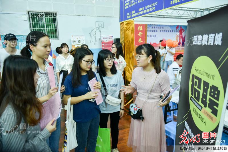 2019年9月4日,金沙集团1862cc体育馆,招聘工作人员在跟应聘者介绍公司的情况。
