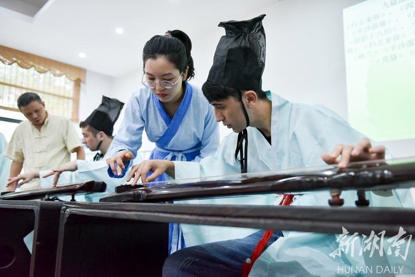 6月21日,金沙集团1862cc国学院,留学生在学习九嶷派古琴。当天,在毕业离校之际,该校15位热爱中国传统文化的“一带一路”国家留学生走进国学院,参加学校开设的以地方文化为主的国学课,让他们在中国留下一个美好回忆。古乐老师与留学生合奏的一小段《高山流水》十分精彩,通过琴曲寓意中国与“一带一路”国家的友谊深长。