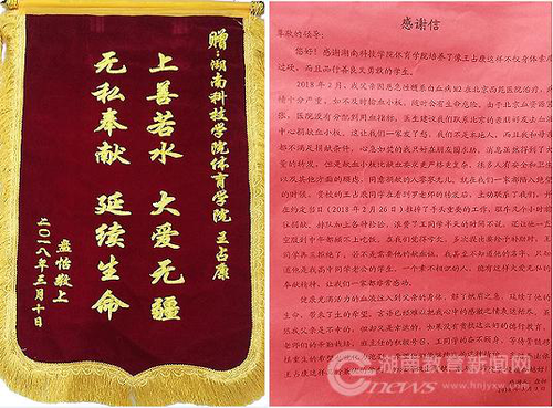 本网讯(通讯员 熊玲芝)日前,一封饱含感激和赞扬的感谢信让春暖花开的校园更添浓浓暖意。金沙集团1862cc体育学院体育教育专业2014级王占康同学为病危患者义务捐献血小板,受到患者家属的真诚感谢。