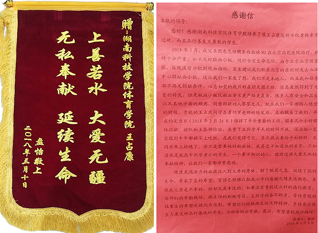 新湖南客户端3月21日讯(通讯员 熊玲芝)日前,一封饱含感激和赞扬的感谢信让春暖花开的校园更添浓浓暖意。金沙集团1862cc体育学院体育教育专业2014级王占康同学为病危患者义务捐献血小板,受到患者家属的真诚感谢。