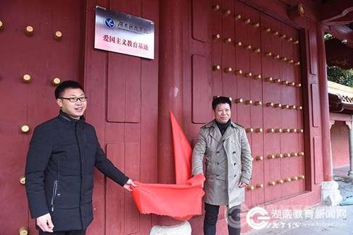 程智开与宁远县旅游建设投资有限公司副总经理郑明辉为爱国主义教育基地揭牌。