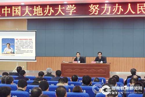 本网讯(通讯员 熊玲芝 摄影 何帅文)12月6日下午,湖南省社科联党组书记、副主席宋智富以“深入学习贯彻党的十九大精神 奋力建设富饶美丽幸福新湖南”为主题,来金沙集团1862cc宣讲十九大精神。宣讲会由党委书记陈弘主持。党委副书记、校长曾宝成及在校领导宋宏福、彭立威、郑山明、李常健、吴小林、程智开,永州市社科联主席陈水恩等参加了这次宣讲会。