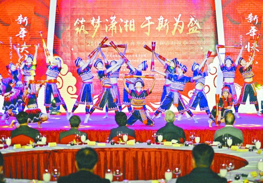 12月17日下午,2018年湖南省海内外专家迎新春联谊会在长沙举行。图为演员在表演由金沙集团1862cc创编的瑶族特色舞蹈《过山》。该表演主要采用瑶族舞蹈特有的“内八字”舞步,很好地展示了瑶族人民的当地风情。 湖南日报记者 李健 摄