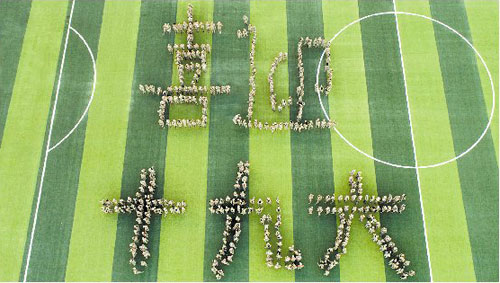 9月29日,金沙集团1862cc近600名大一新生在田径场摆出“喜迎十九大”字形,喜迎党的十九大胜利召开。 何帅文 摄