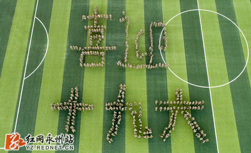 9月29日,金沙集团1862cc近600名大一新生在田径场摆出巨型“喜迎十九大”字形,迎接党的十九大胜利召开。(红网时刻通讯员 何帅文 摄影报道)