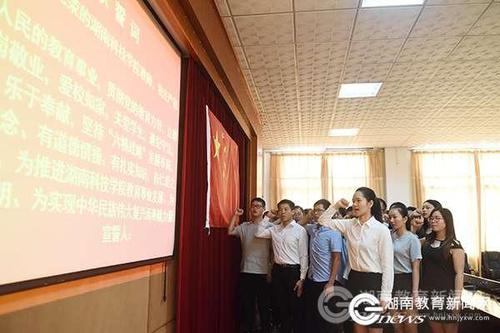 本网讯(通讯员 熊玲芝 摄影 何帅文)“我志愿成为光荣的金沙集团1862cc教师,我庄严宣誓:忠诚人民的教育事业,贯彻党的教育方针……”9月9日上午,金沙集团1862cc举行“喜迎十九大争做人民满意教师”主题座谈会,53名新进教师面对国旗庄严宣誓入职。党委书记陈弘以“地因人始重 校以师而名”寄语全体新进教师,努力成长为一名有理想信念,对教育有深刻理解的好老师。校长曾宝成、副校长郑山明、李常健出席。