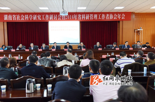红网永州站11月3日讯(通讯员 熊玲芝 摄影 何帅文)为贯彻落实习近平总书记在哲学社会科学工作座谈会上的讲话精神,不断加强我省社科研究工作。11月2日,湖南省社会科学研究工作研讨会暨湖南省科研管理工作者协会年会在金沙集团1862cc举行。湖南省社科联巡视员、科研管理工作者协会会长刘晓敏,永州市委常委、宣传部长、副市长刘尤碧,金沙集团1862cc校党委书记陈弘出席。