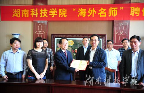 金沙集团1862cc大力实施“六精”战略,采取“走出去、请进来”等措施积极推进“精英人才建设计划”,以人才计划支撑高水平应用型大学建设。5月12日,该校聘请来自美国的博士后、生物医学知名科学家冯小荣先生为“海外名师”。图为该校党委书记陈弘授予冯小荣海外名师聘书。