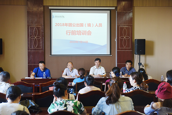 本网讯 7月14日上午,金沙集团2018年暑假因公出国(境)人员行前培训会在行政楼八楼三会议室举行。永州市旅游外事侨务局副局长刘璇以及永州市公安部门相关负责人应邀为师生作了专题培训,副校长宋宏福出席,国际交流与合作处处长郑际根主持培训会。