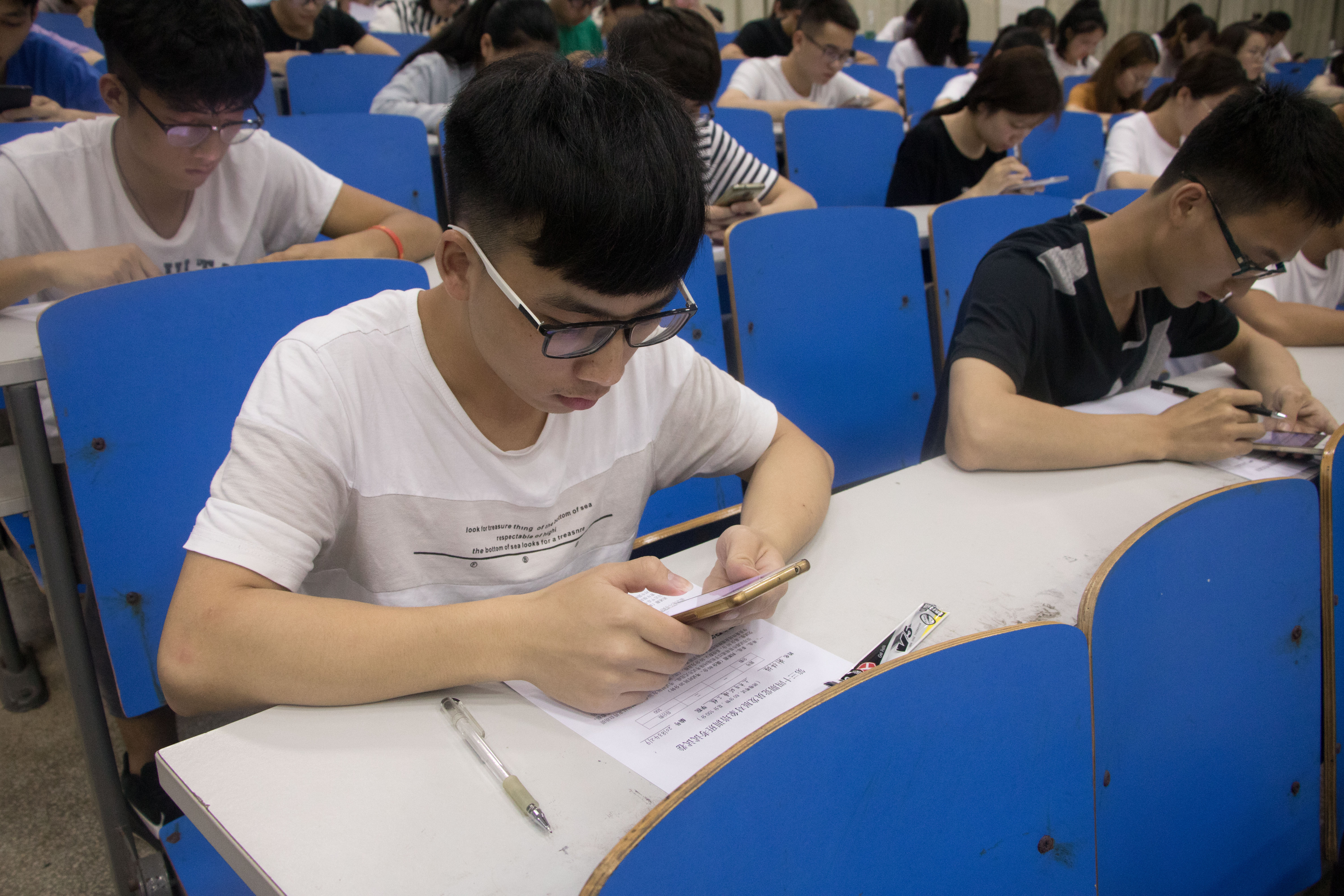 本网讯 5月11日晚,党校举行第三十四期党校培训班集中结业考试。考场内没有大量传统的纸质试卷,而是考生人手一部手机,通过进入金沙集团1862cc党校微信公众平台“学习园地”板块,依次完成登录、做题、交卷等程序,完成考试。